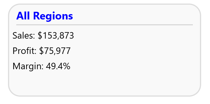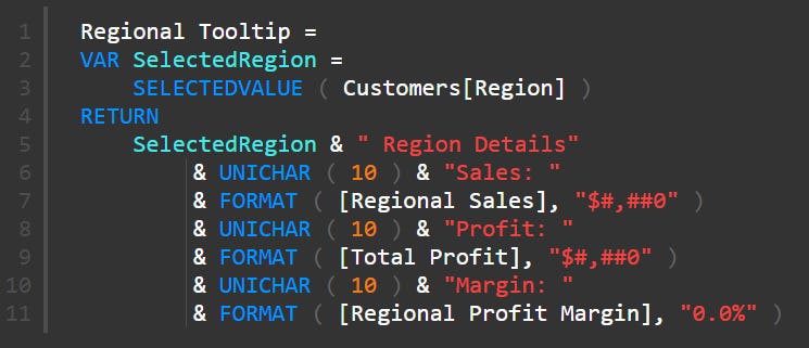 Weâll build a dynamic âRegional Tooltipâ that displays Sales, Profit, and Margin metrics with color, dividers, and rounded corners â all driven by DAX!