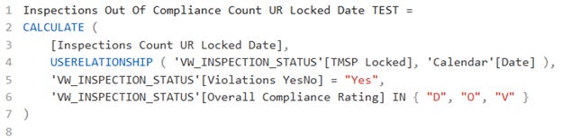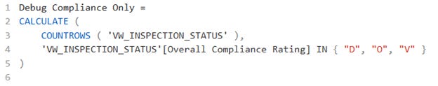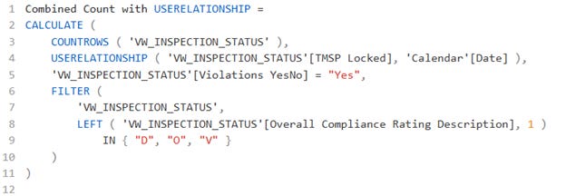 Explanation: We activate the relationship with USERELATIONSHIP and apply both filters for violations and compliance ratings.