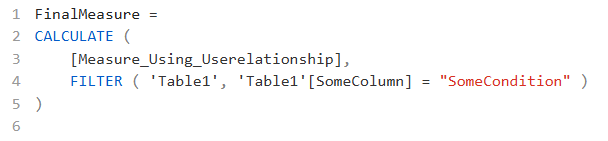 To incorporate both USERELATIONSHIP and the filter conditions into a single calculation, let's start by breaking it down. Since USERELATIONSHIP doesn’t always work directly with added filters, let’s walk through this to see how to work around the issue.