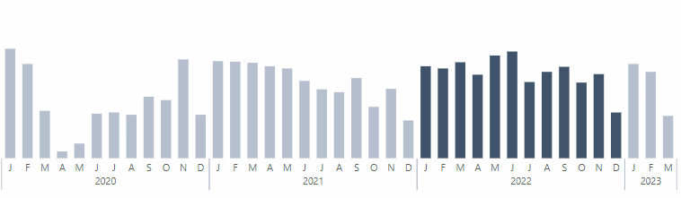 If a year is selected and matches the current year, the bar is highlighted in a specific color (e.g., slate gray).