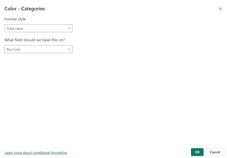 SelectedYear: Captures the year selected in theSlicer Yeartable.CurrentYear: Captures the year associated with the current bar in the visual.Logic: